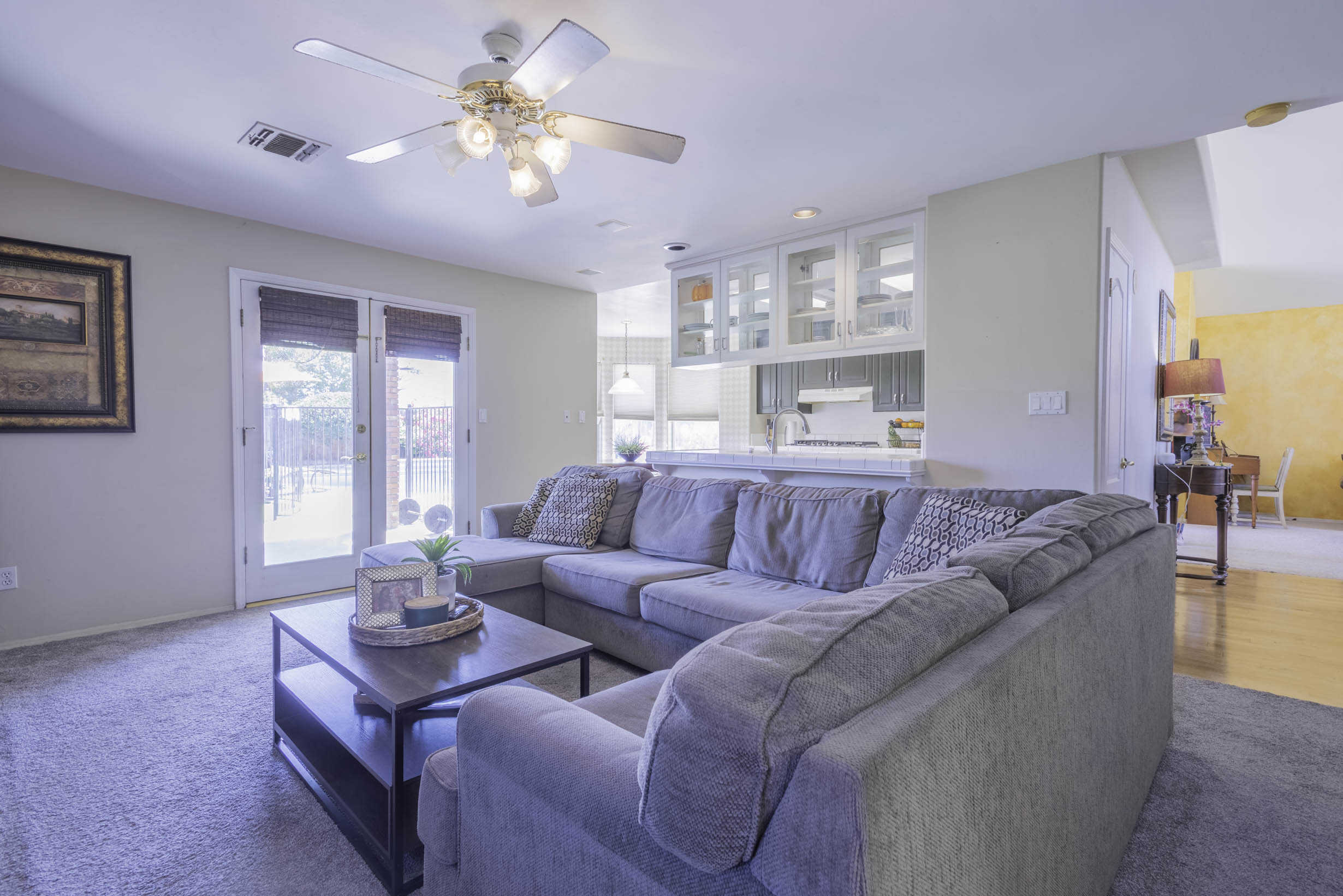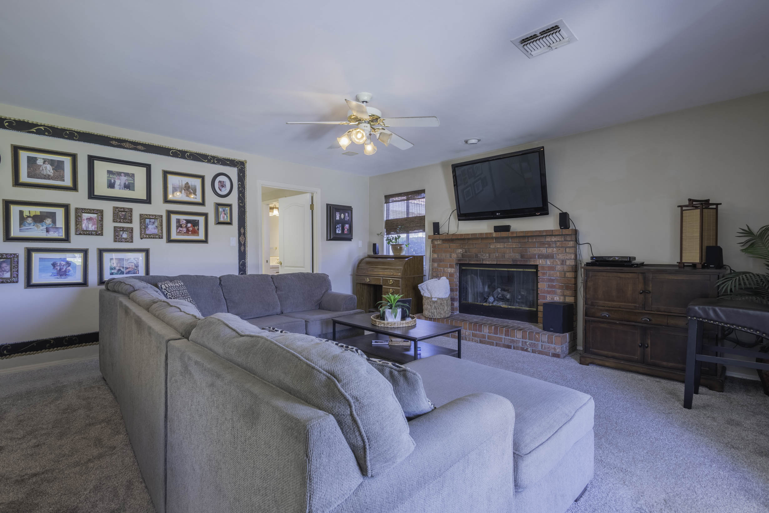 Formal living/dining + gathering space w/fireplace & French doors to rear covered patio