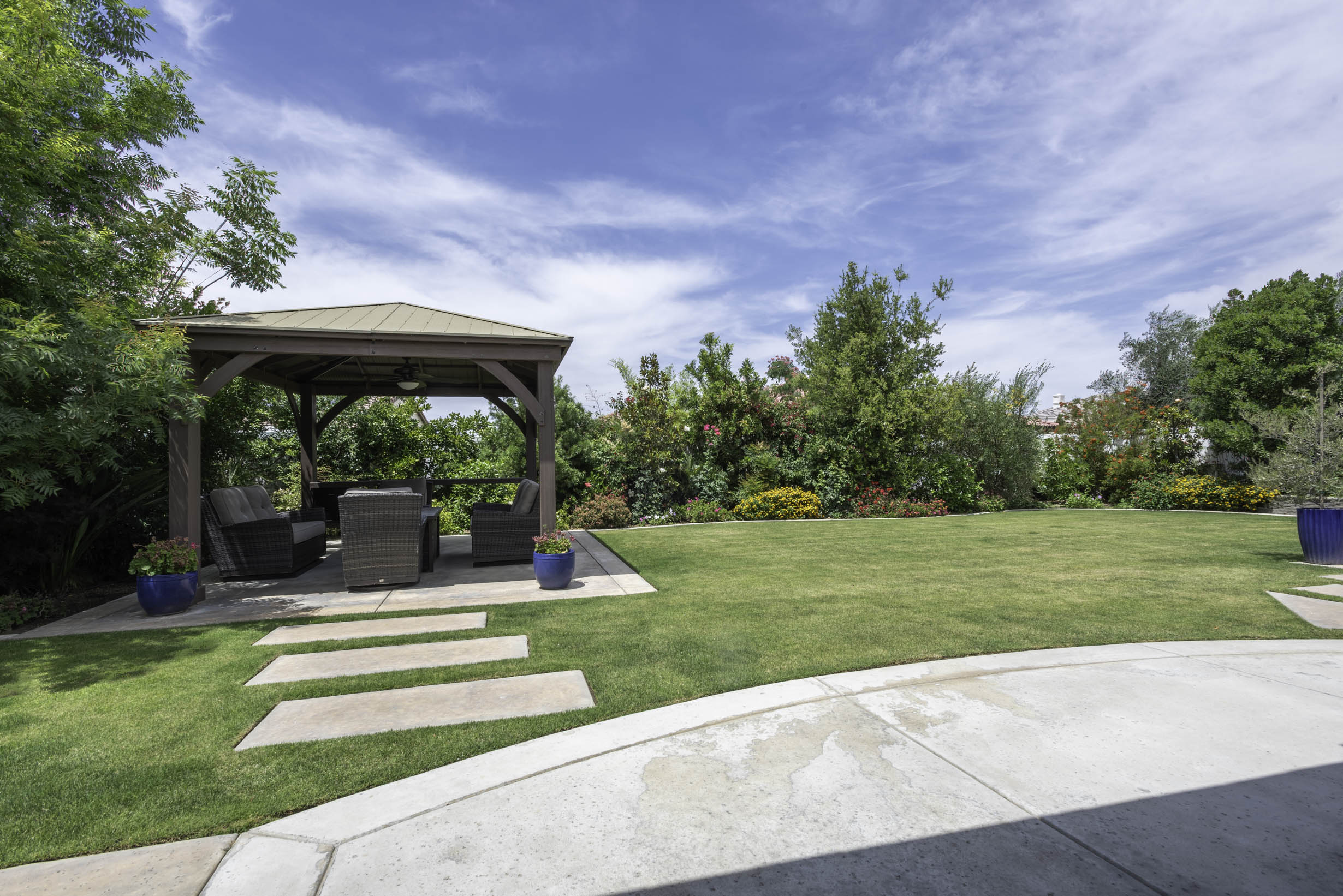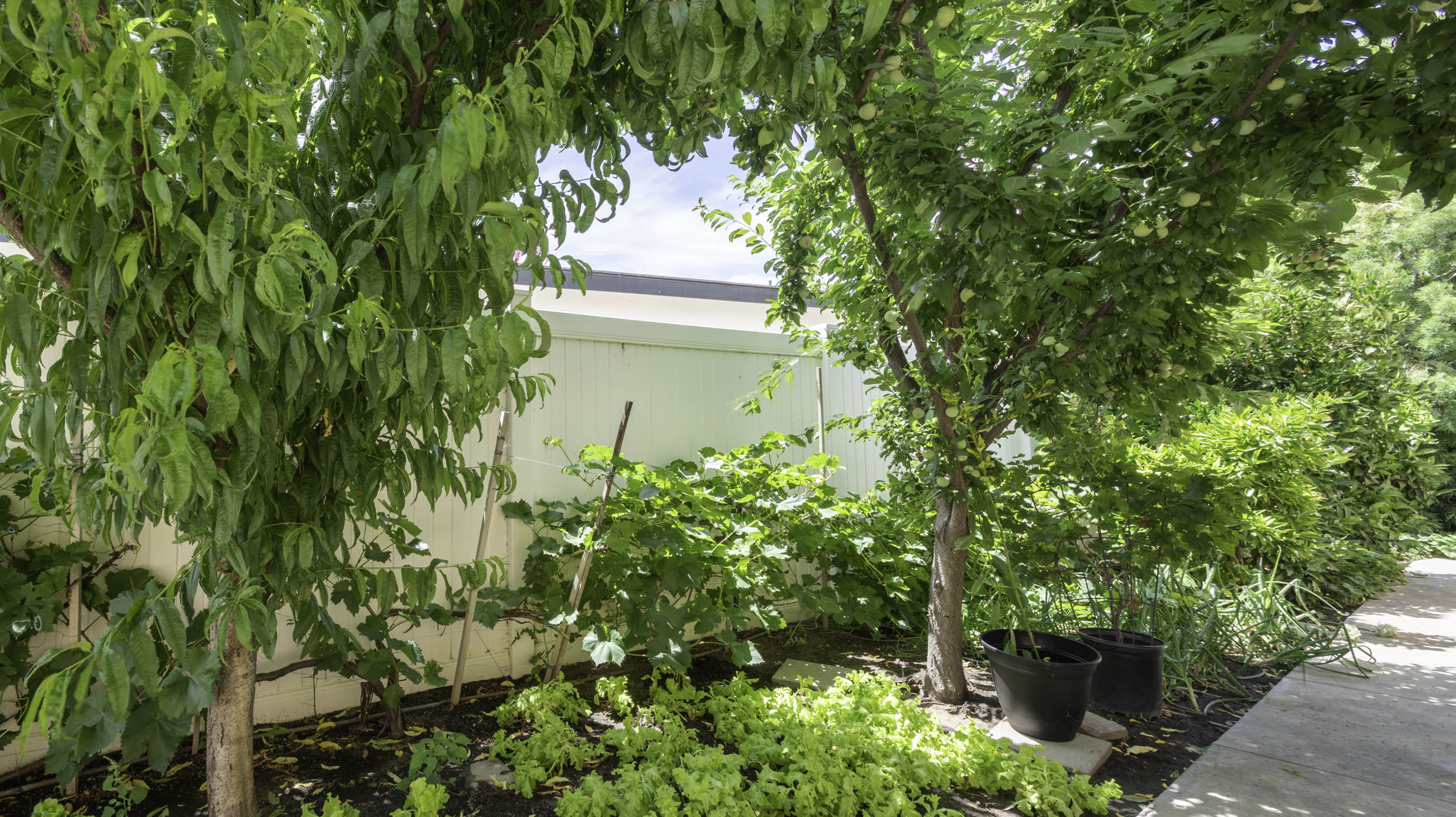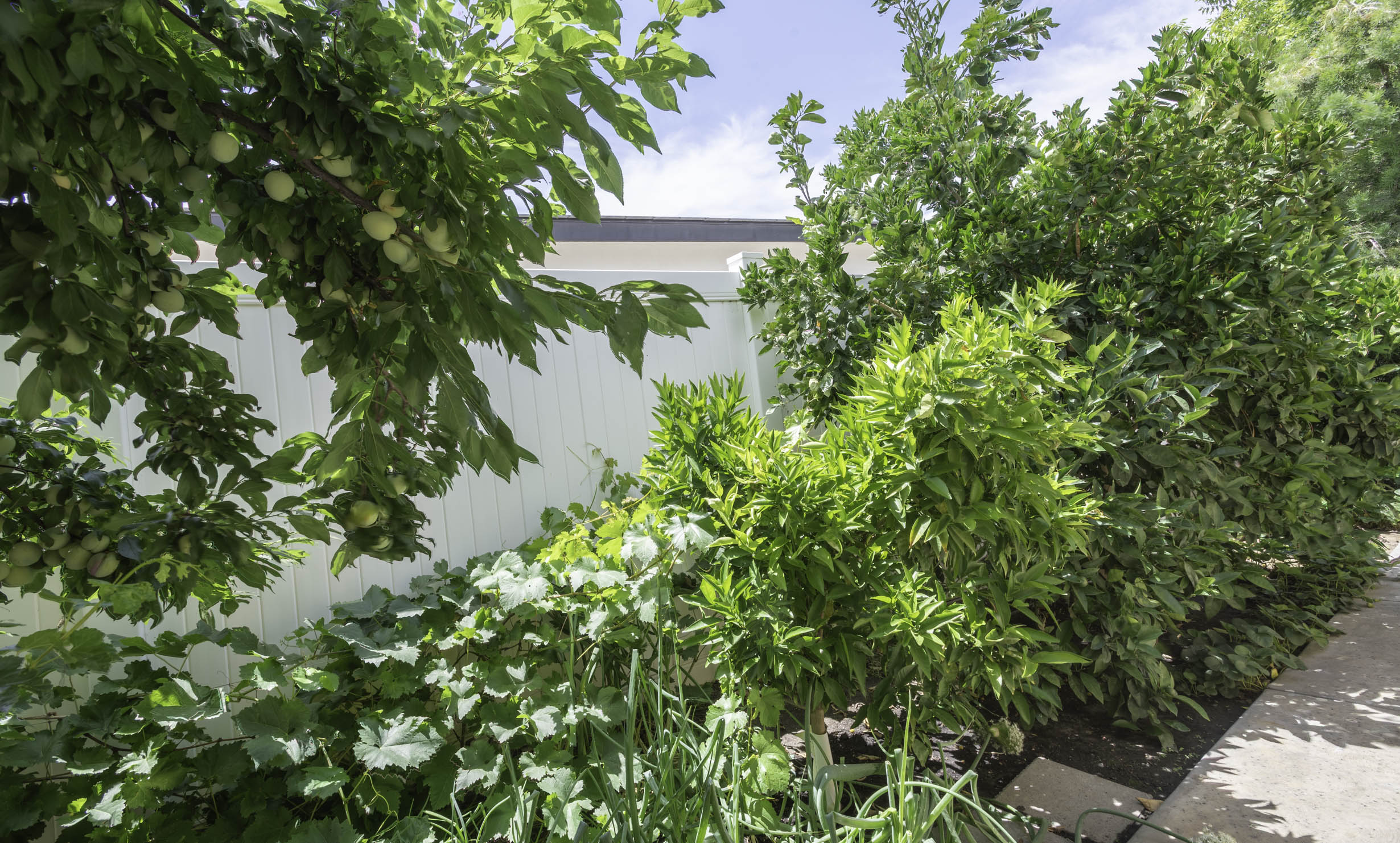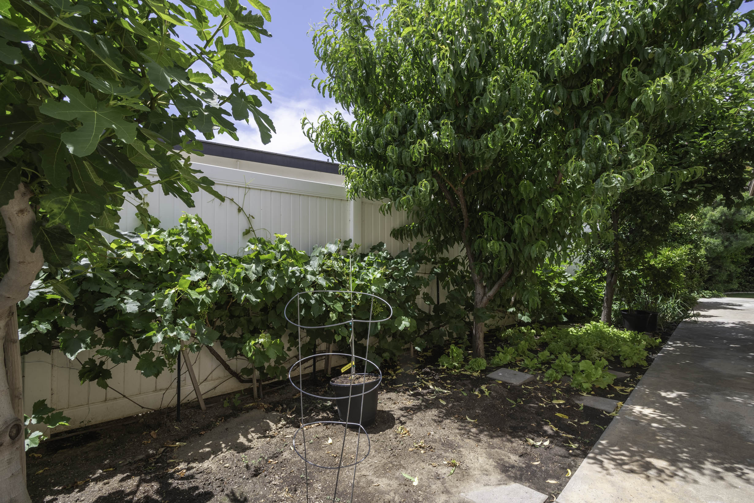 Manicured front and rear yards; citrus and fruit trees, avocados, artichokes, pomegranates, grapes