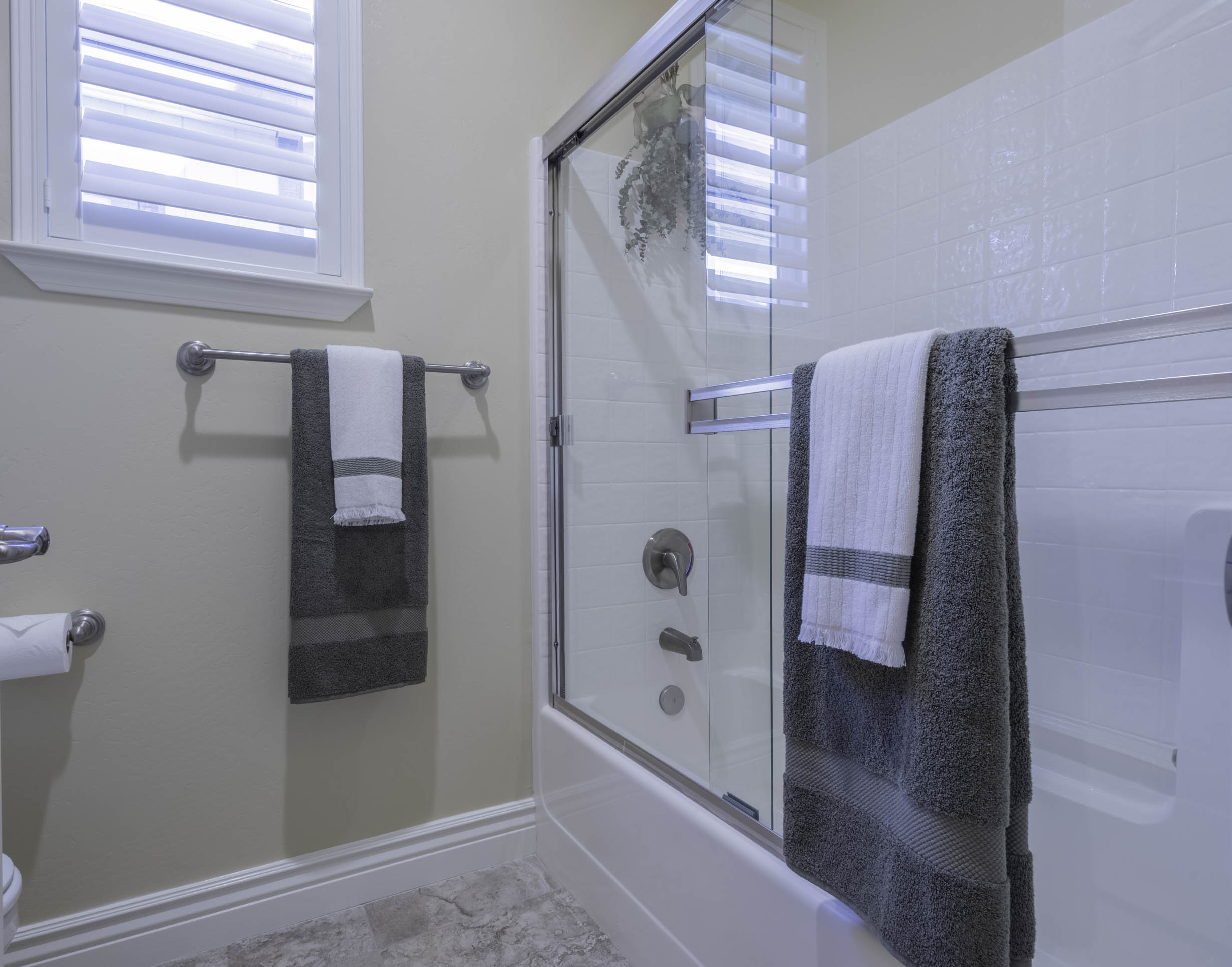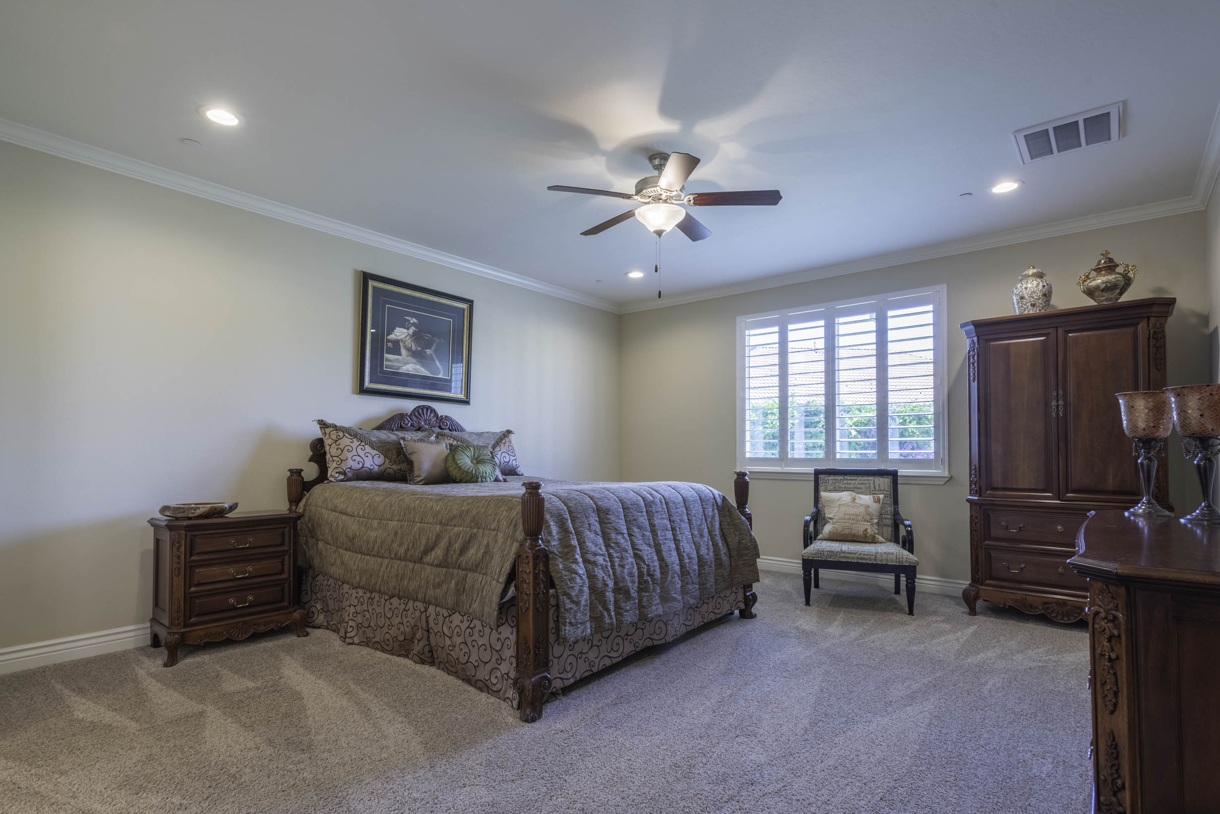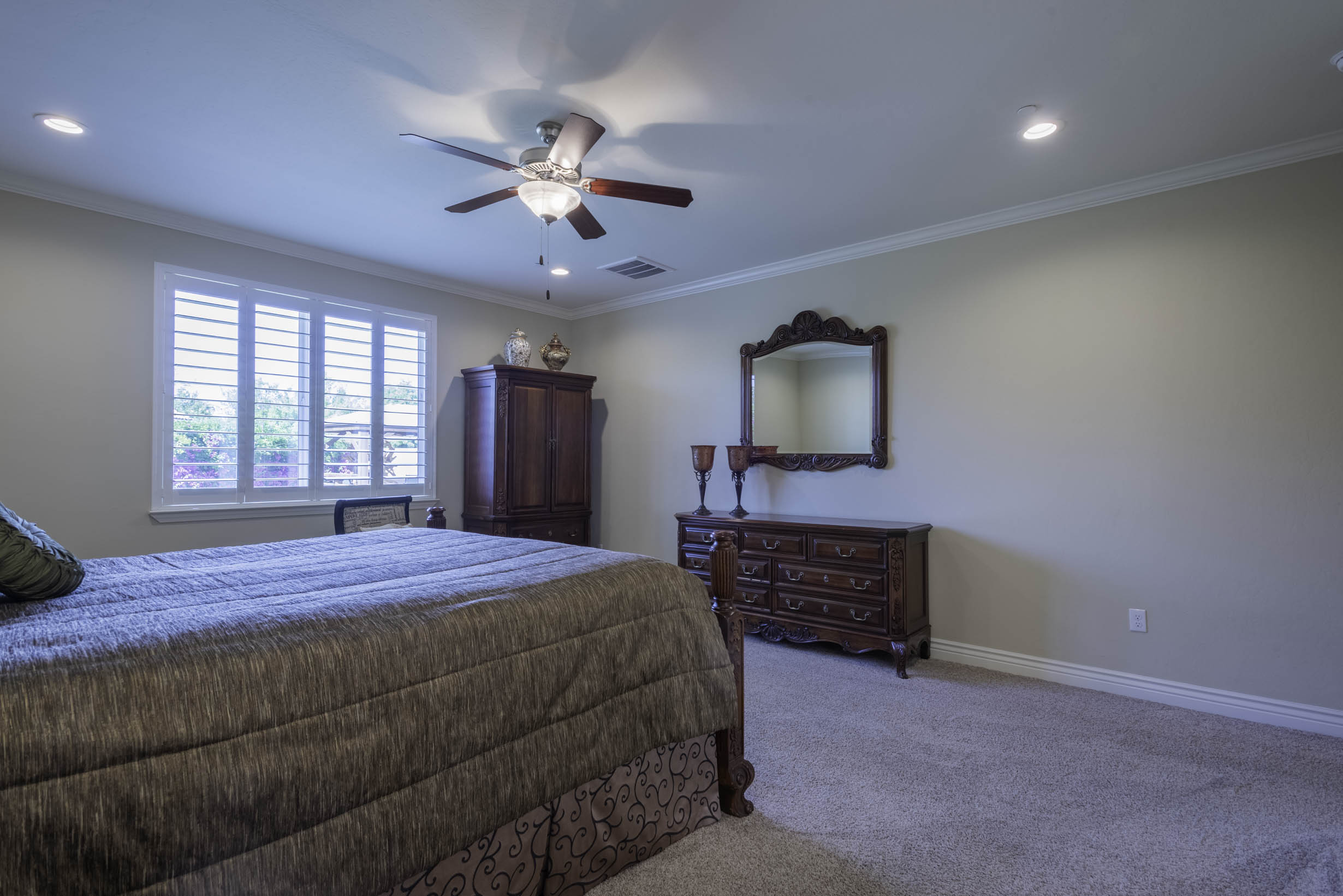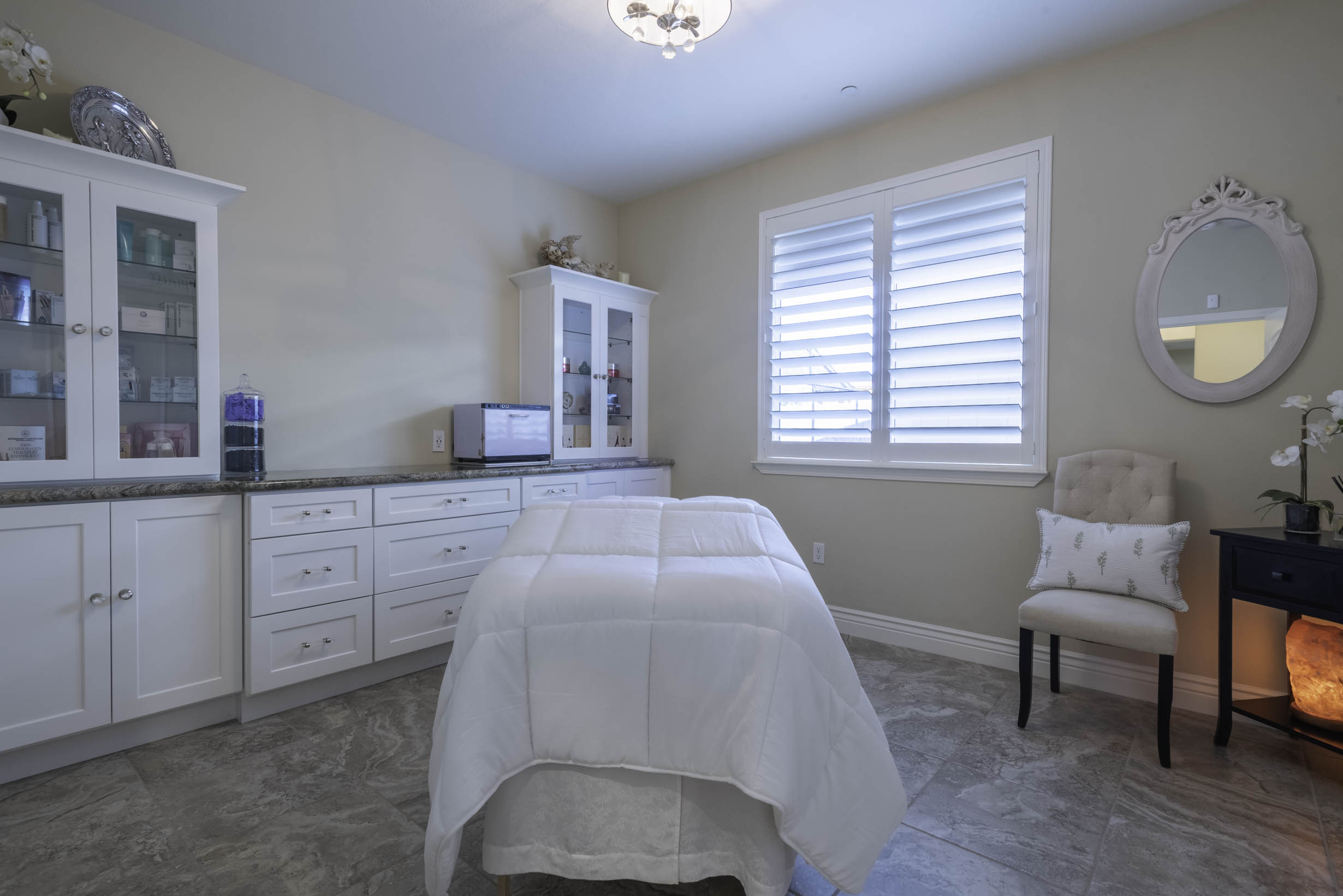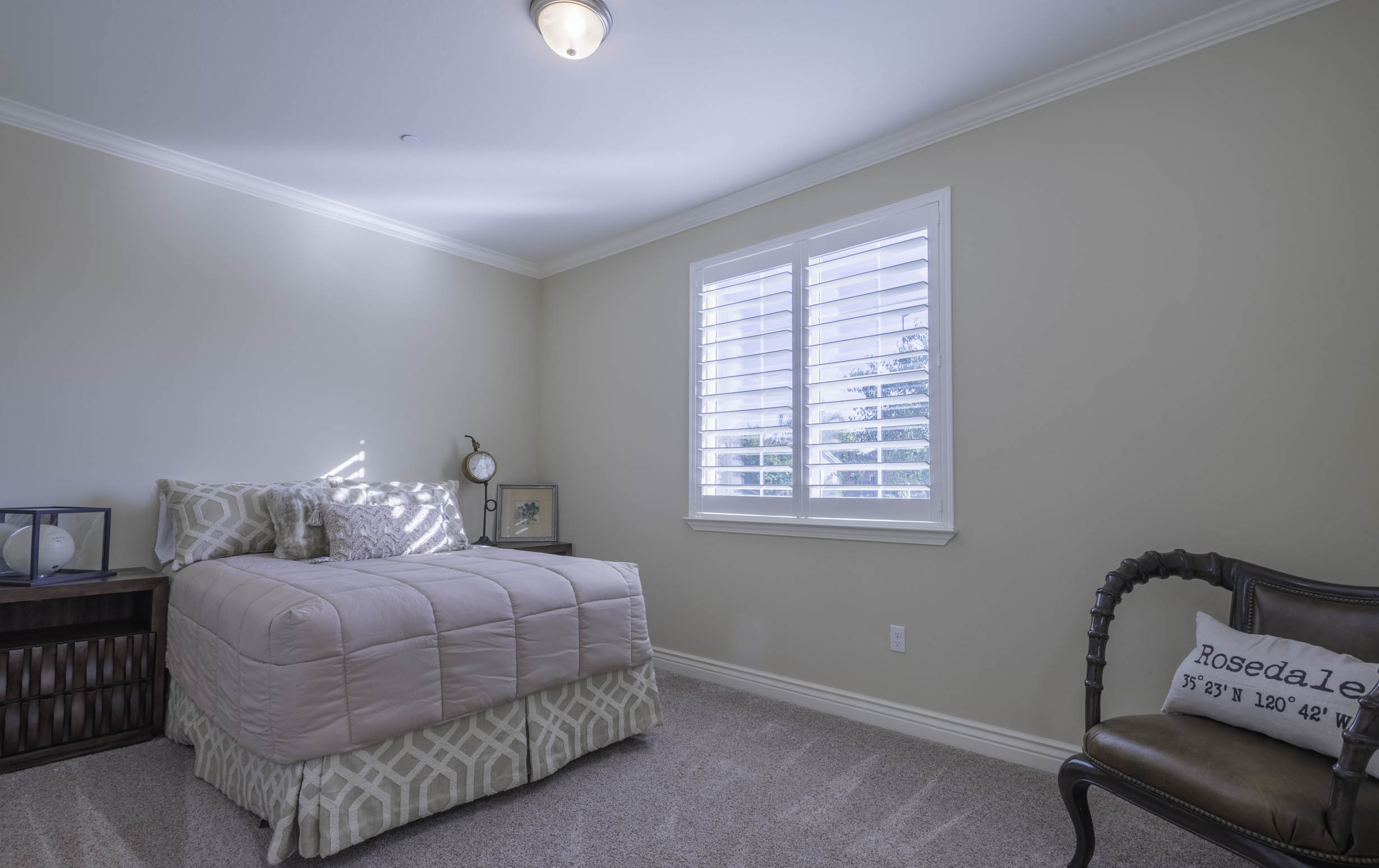 Shuttered window coverings + designer lighting