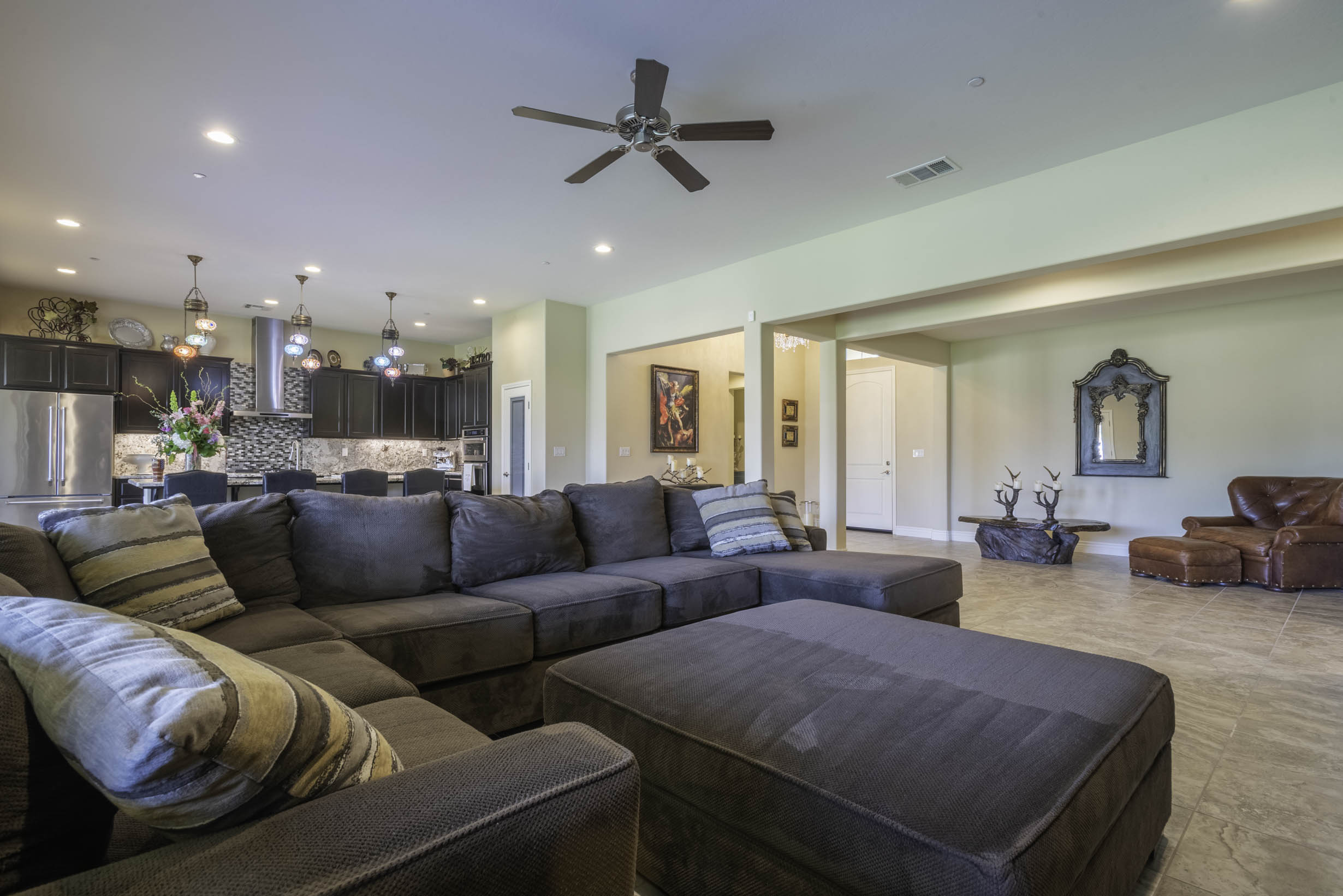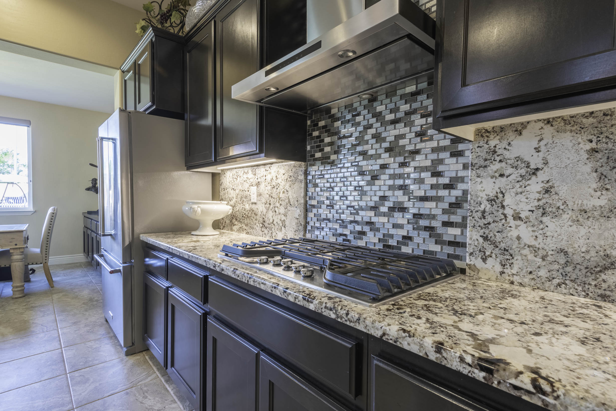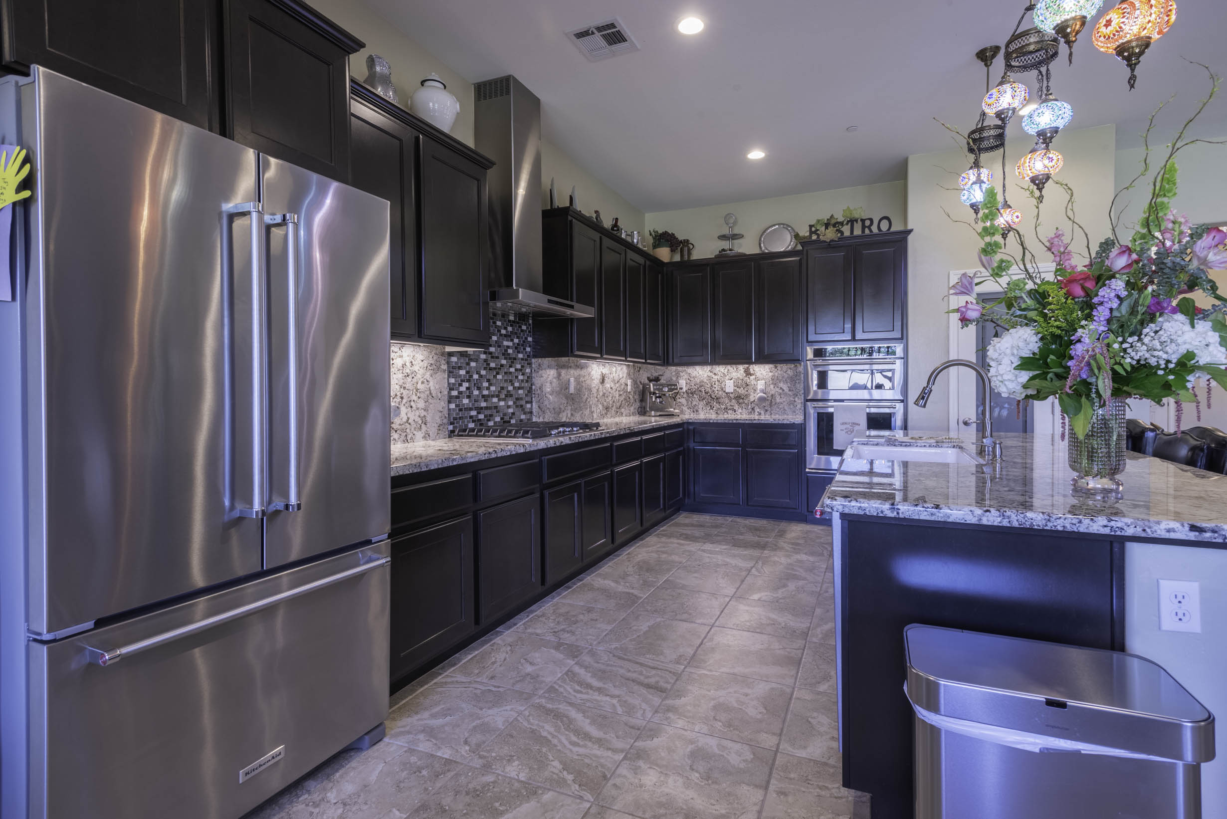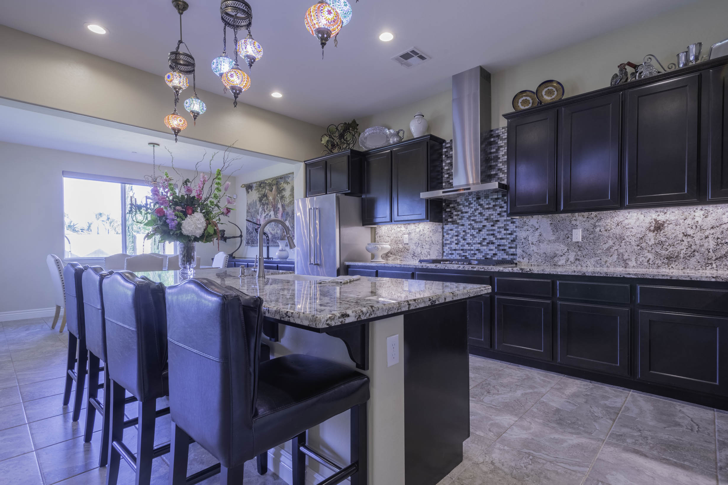 Gourmet kitchen w/SS appliance package, 5 burner gas cooktop, large prep island w/wine refrig & bar-top seating