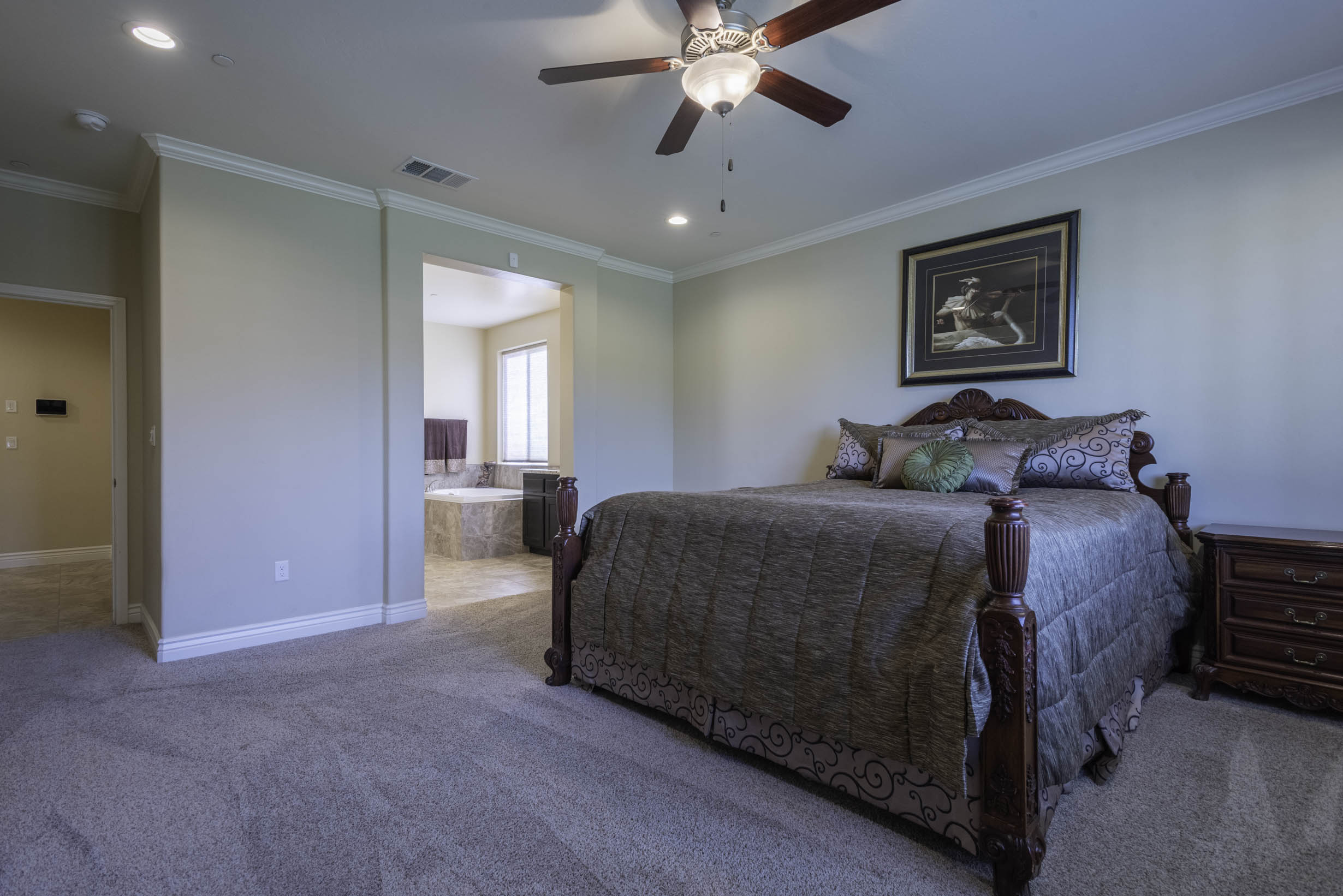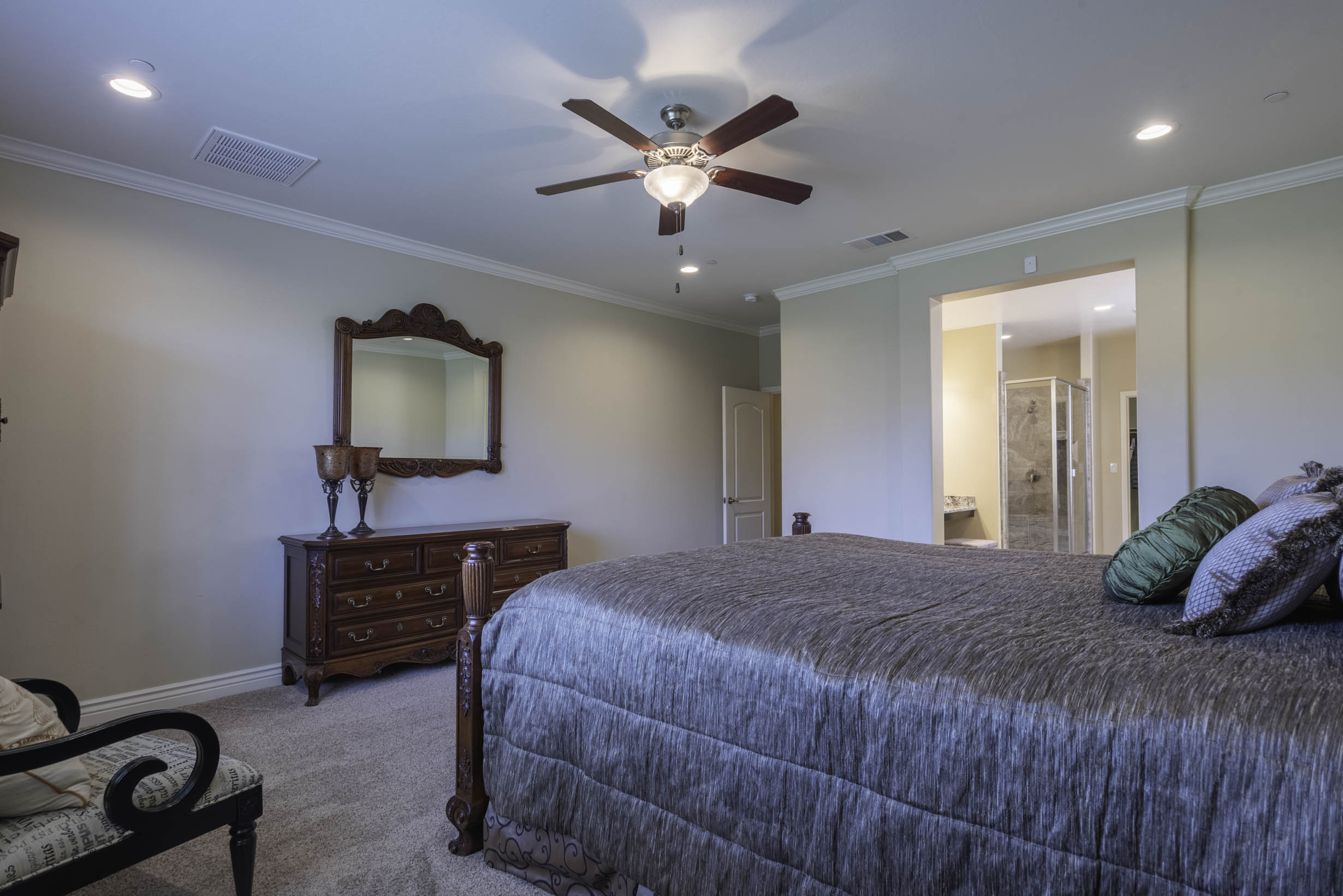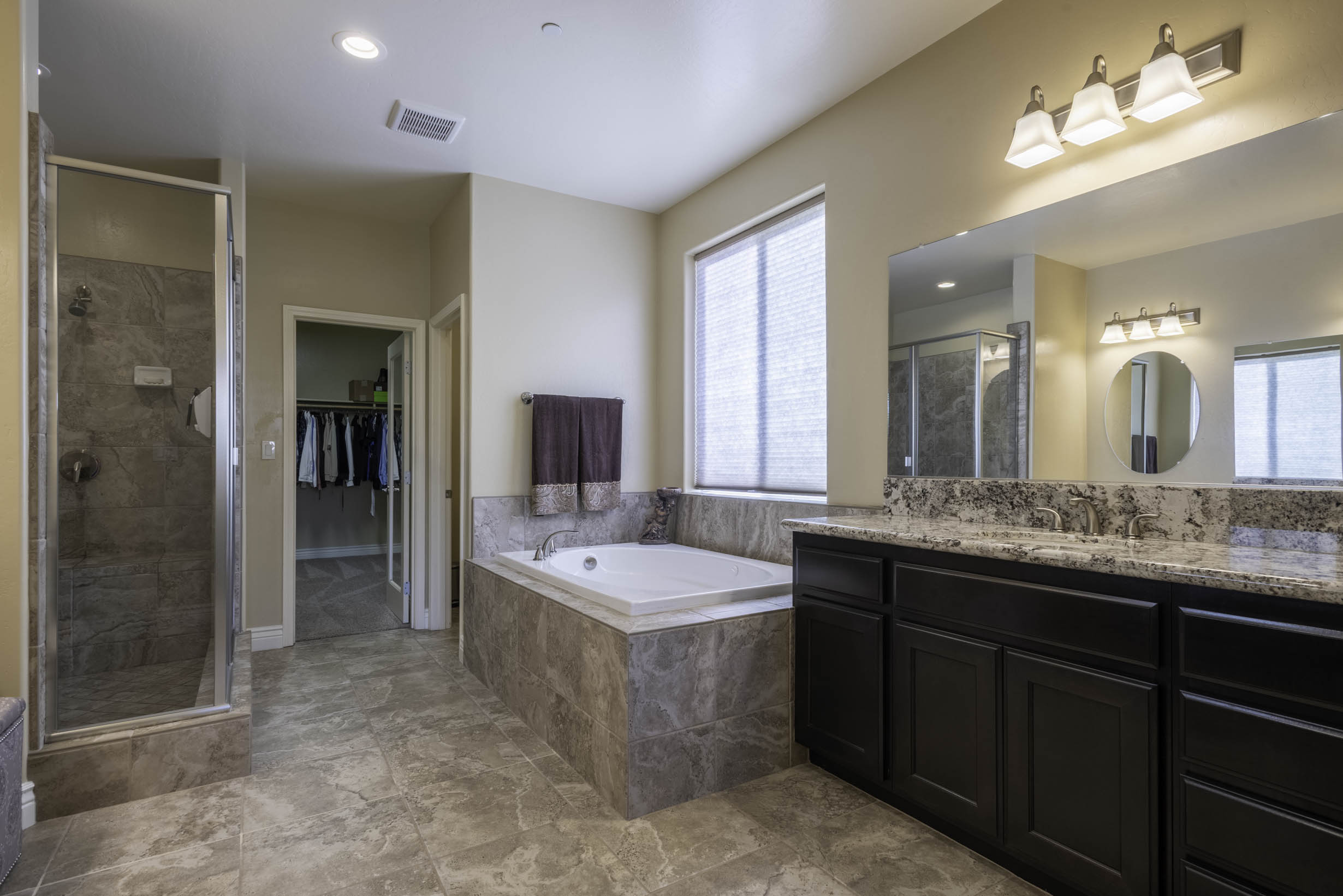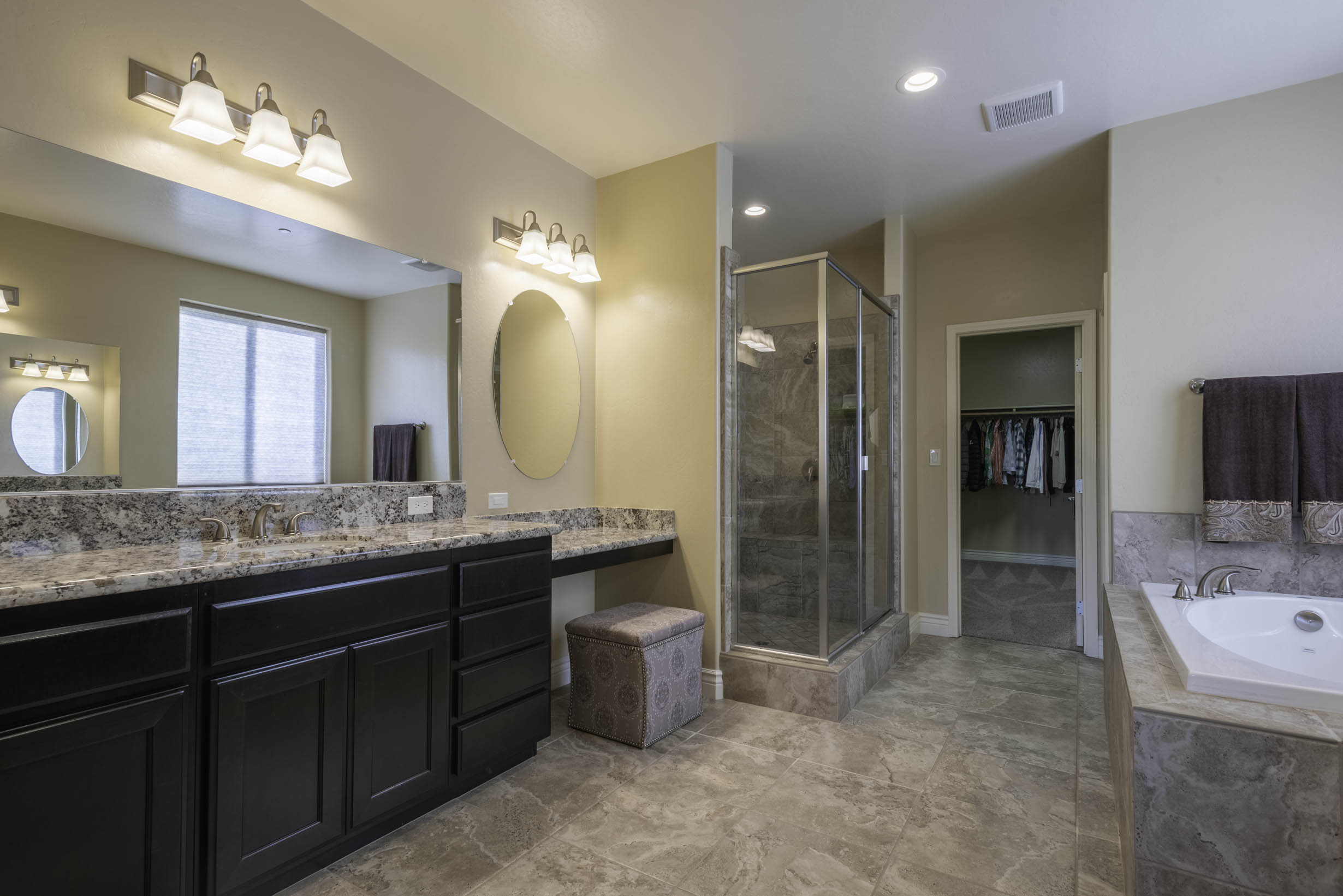 Primary retreat complete w/ensuite; stall shower, garden tub, separate dual vanities, make-up vanity, large wardrobe