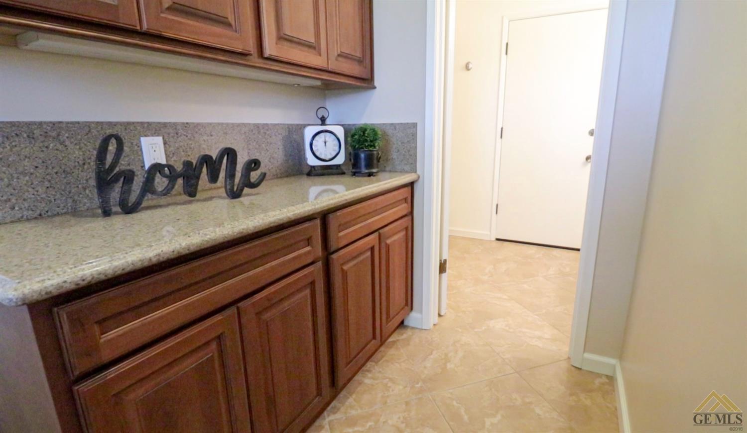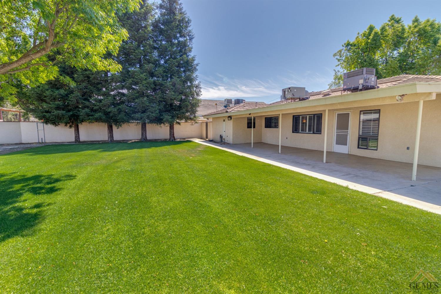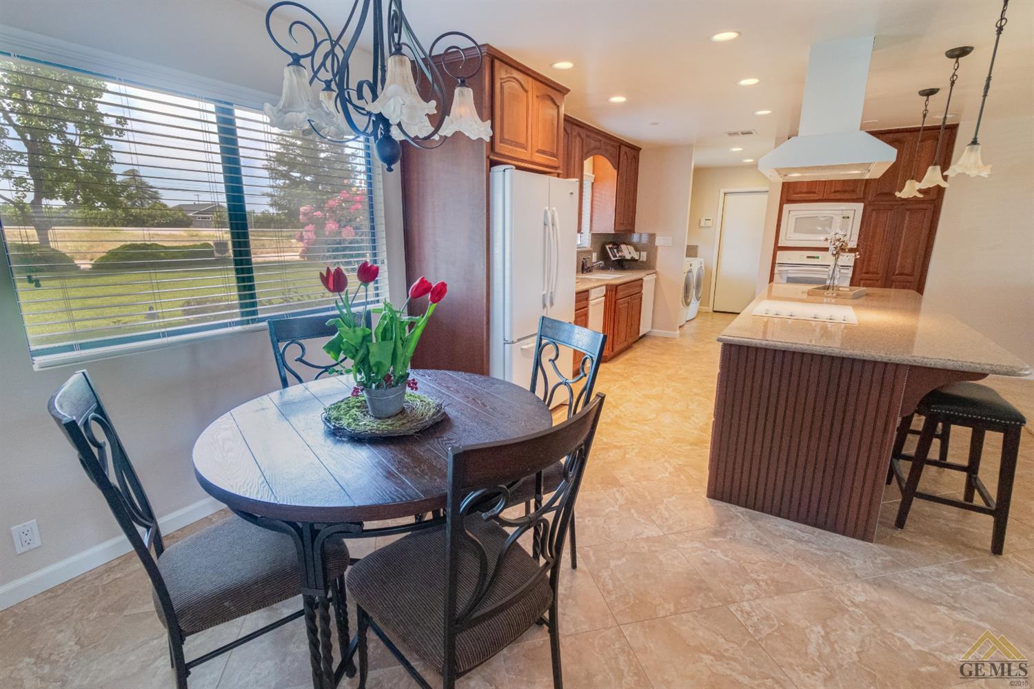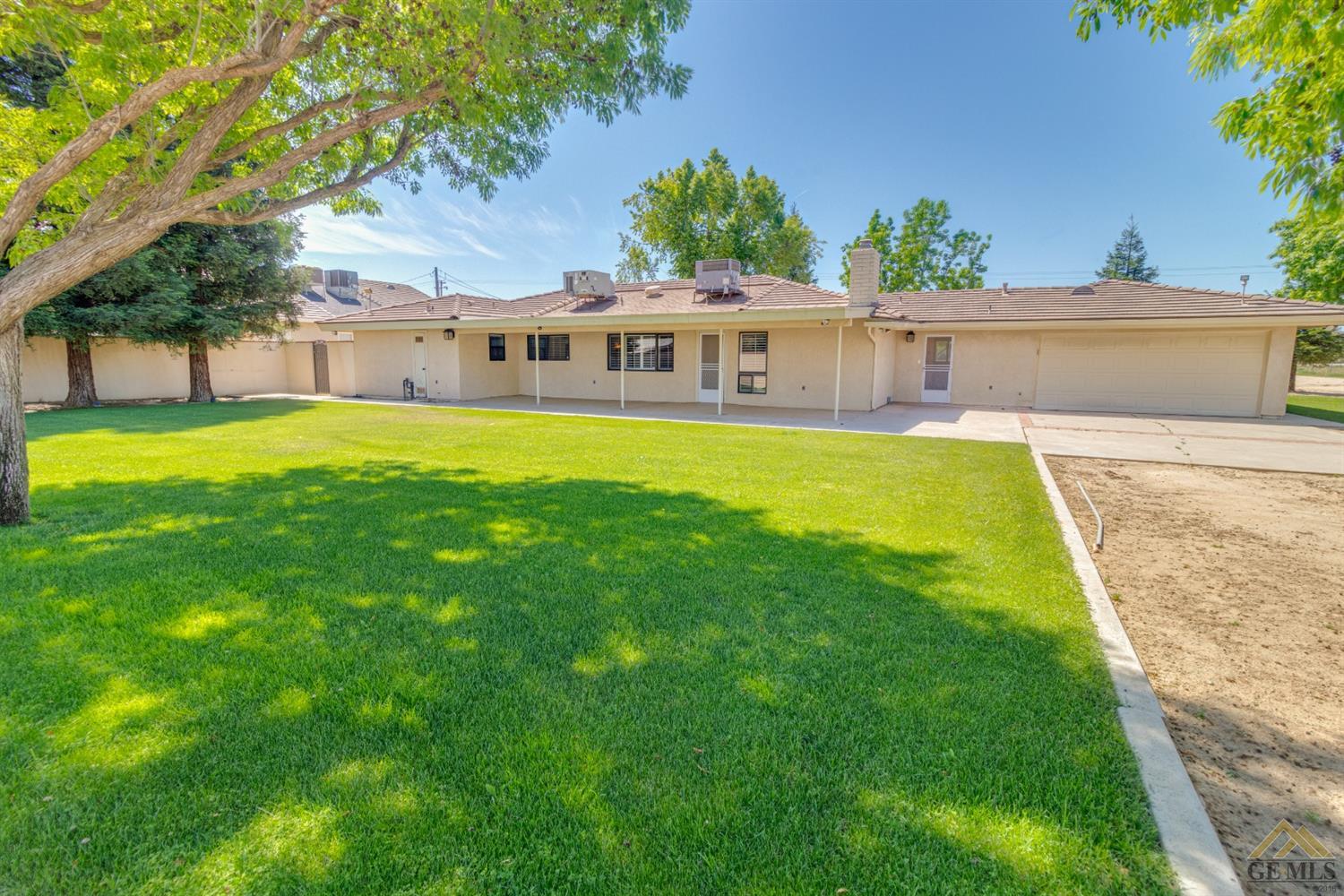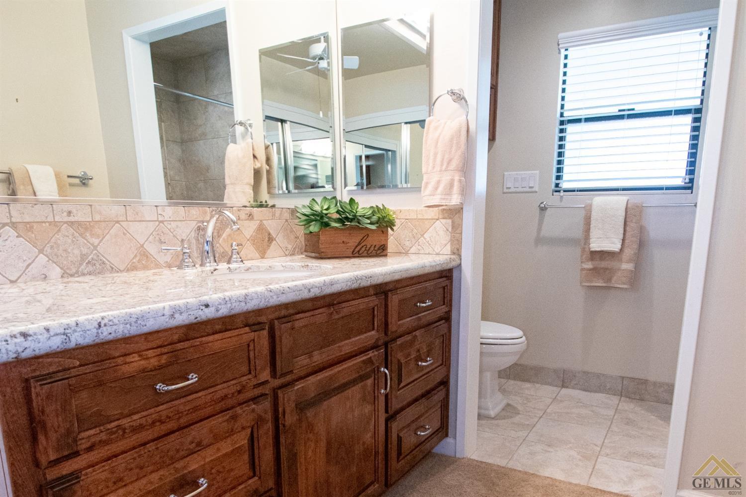 | Here’s a fantastic opportunity to own a single-story 4 bedroom 2 3/4 bath home on a large lot in the country-like atmosphere of Northwest Bakersfield! With an appealing open floor plan ideal for entertaining, you’ll find a spacious greatroom w/large corner slump-stone fireplace, lovely kitchen & sunny breakfast nook. This beautiful kitchen features spacious granite-slab island w/breakfast seating, glass cook top and beautiful pendant lighting. Generous stained cabinets. Just off the kitchen is a large storage area that leads into the laundry room w/built-in cabinets as well as an additional bath. The master retreat has a built-in book case & ensuite with a mirrored wardrobe space and shower. Generous appointments throughout include shuttered & blind window treatments, neutral tile and carpet flooring. Exterior amenities include spacious & mature front & rear landscaping w/a large covered patio & 2 car garage set back off the main street. There’s so much room to roam! |