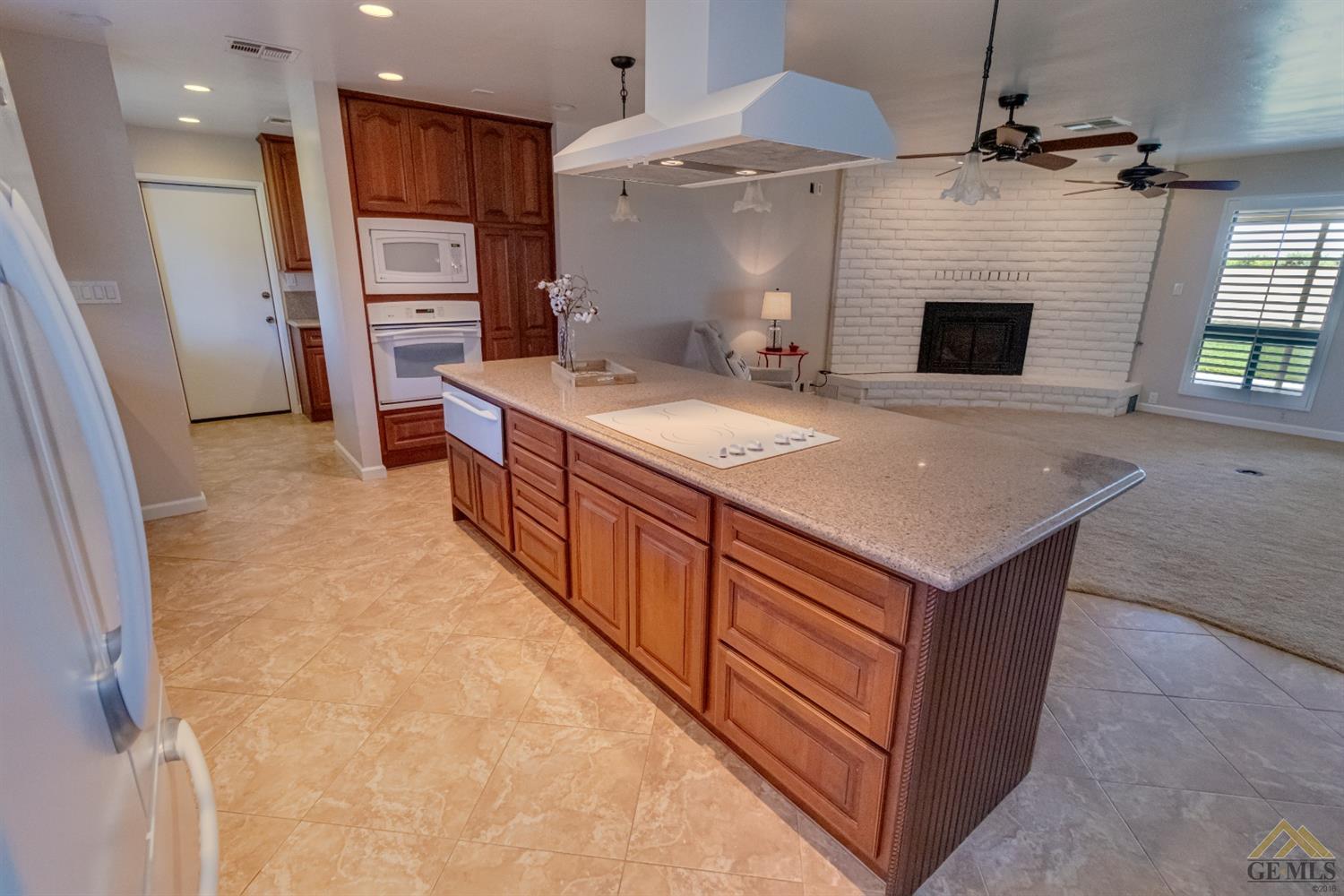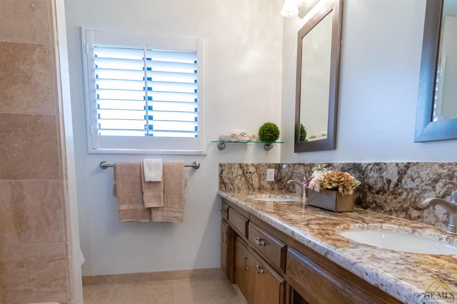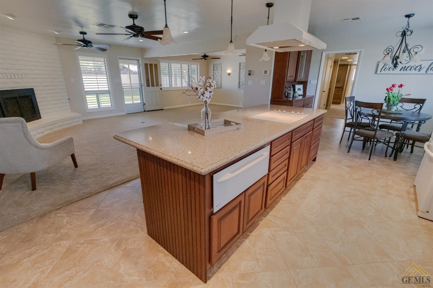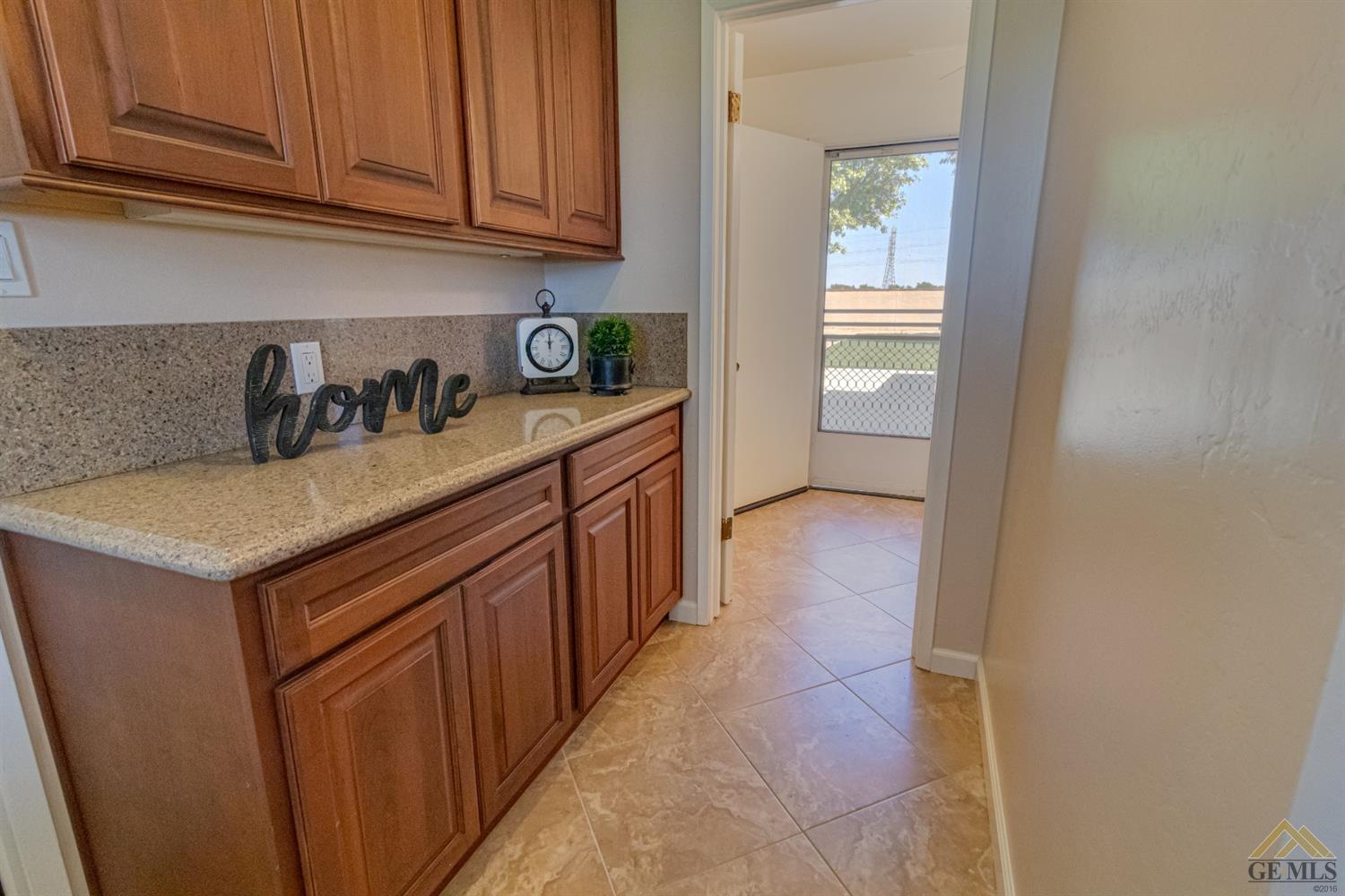 | Here’s a fantastic opportunity to own a single-story 4 bedroom 2 3/4 bath home on a large lot in the country-like atmosphere of Northwest Bakersfield! With an appealing open floor plan ideal for entertaining, you’ll find a spacious greatroom w/large corner slump-stone fireplace, lovely kitchen & sunny breakfast nook. This beautiful kitchen features spacious granite-slab island w/breakfast seating, glass cook top and beautiful pendant lighting. Generous stained cabinets. Just off the kitchen is a large storage area that leads into the laundry room w/built-in cabinets as well as an additional bath. The master retreat has a built-in book case & ensuite with a mirrored wardrobe space and shower. Generous appointments throughout include shuttered & blind window treatments, neutral tile and carpet flooring. Exterior amenities include spacious & mature front & rear landscaping w/a large covered patio & 2 car garage set back off the main street. There’s so much room to roam! |