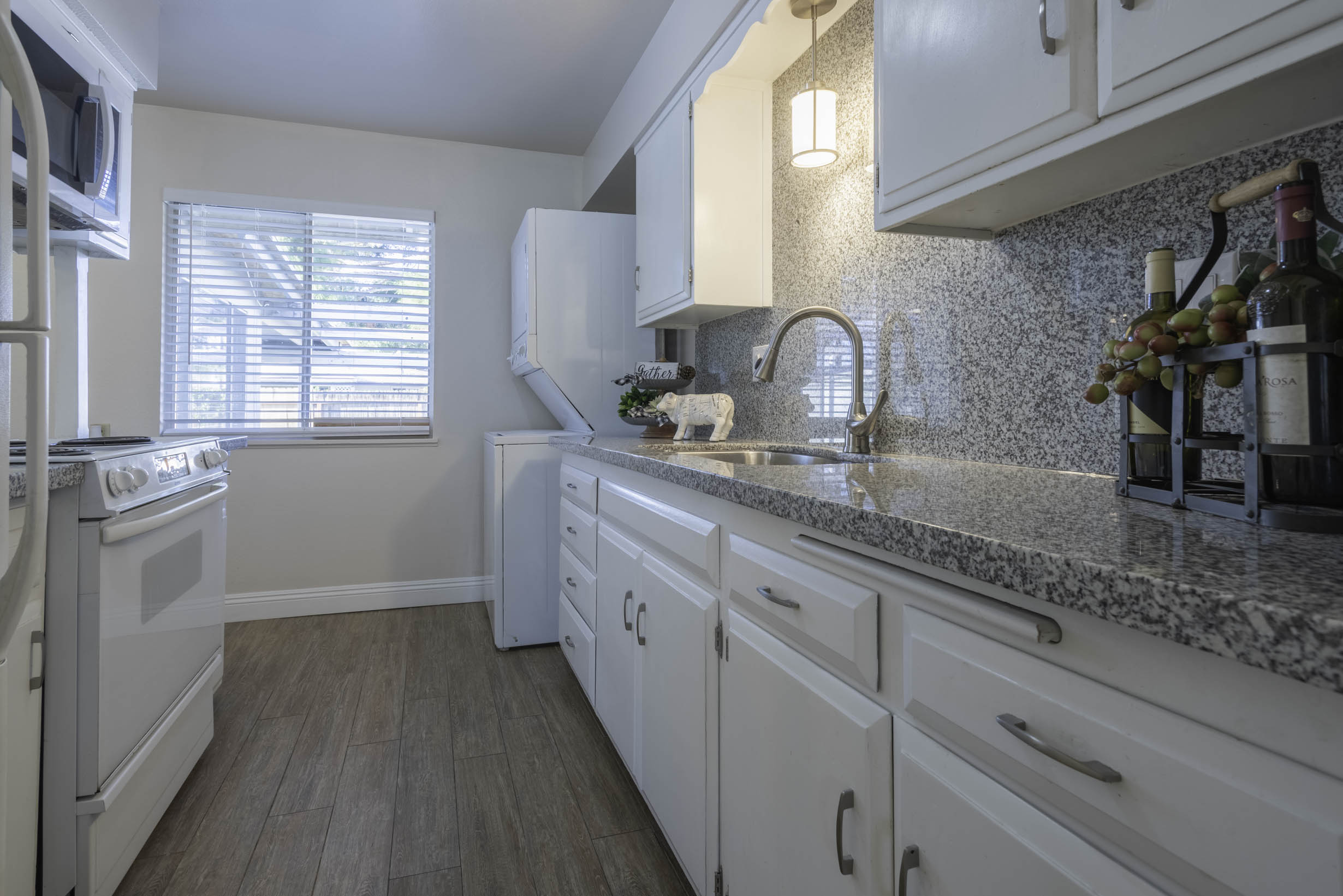 Updated Kitchen; crisp white cabinets, white appliance pkg w/range & micro hood, stainless sink