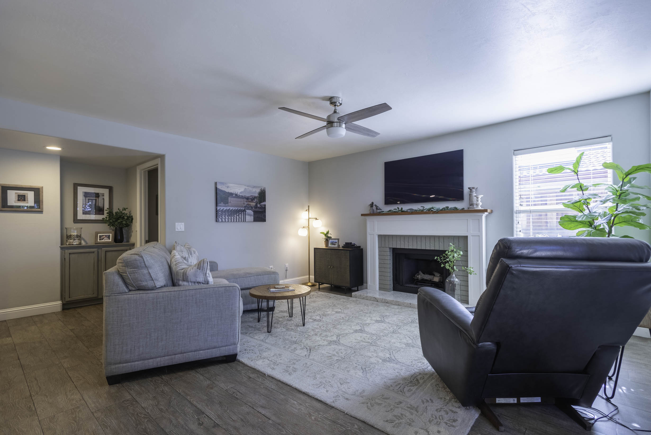 Great room w/cozy fireplace + French doors to covered patio