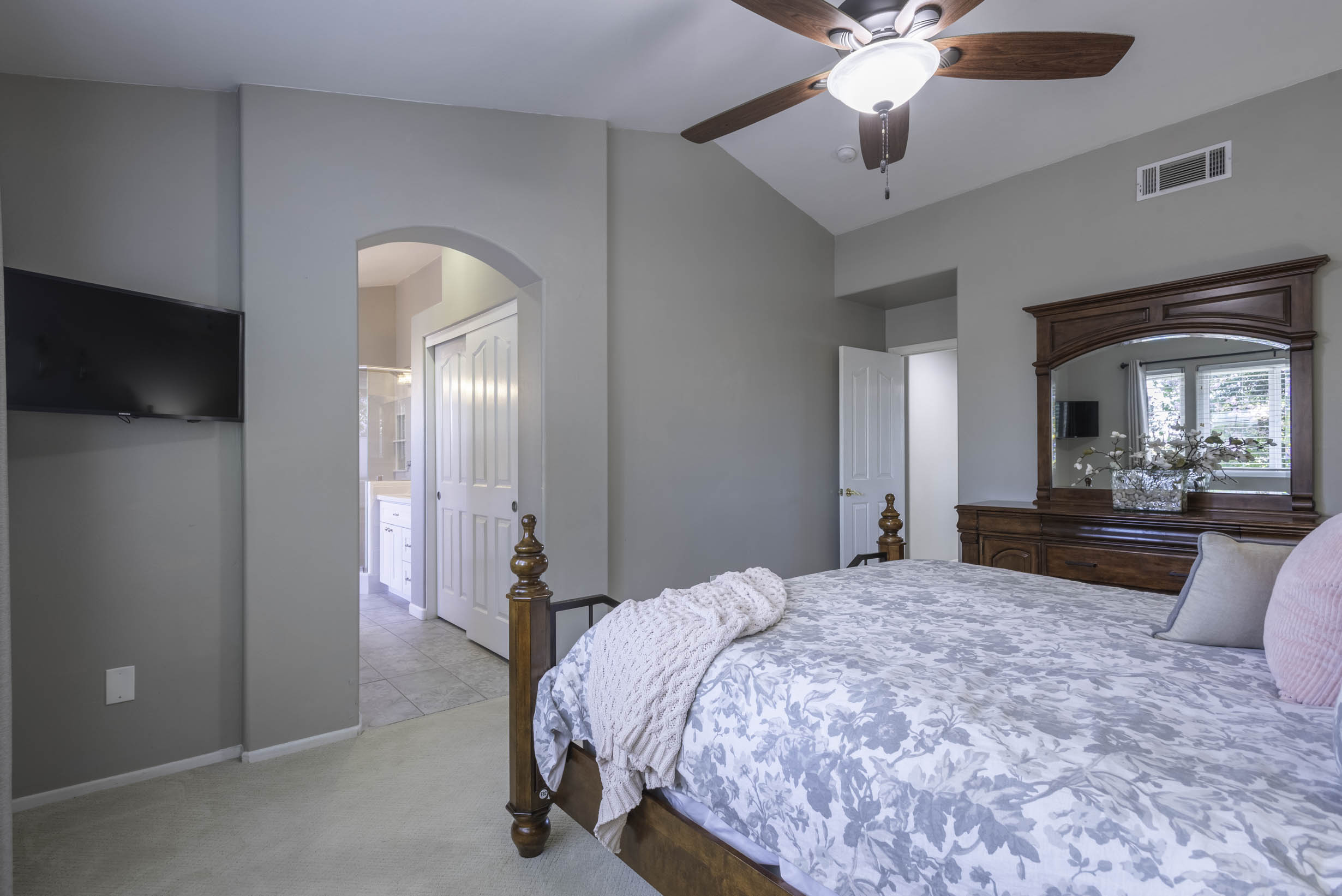 Primary retreat w/spacious ensuite; split dual vanities, soaking tub, shower stall